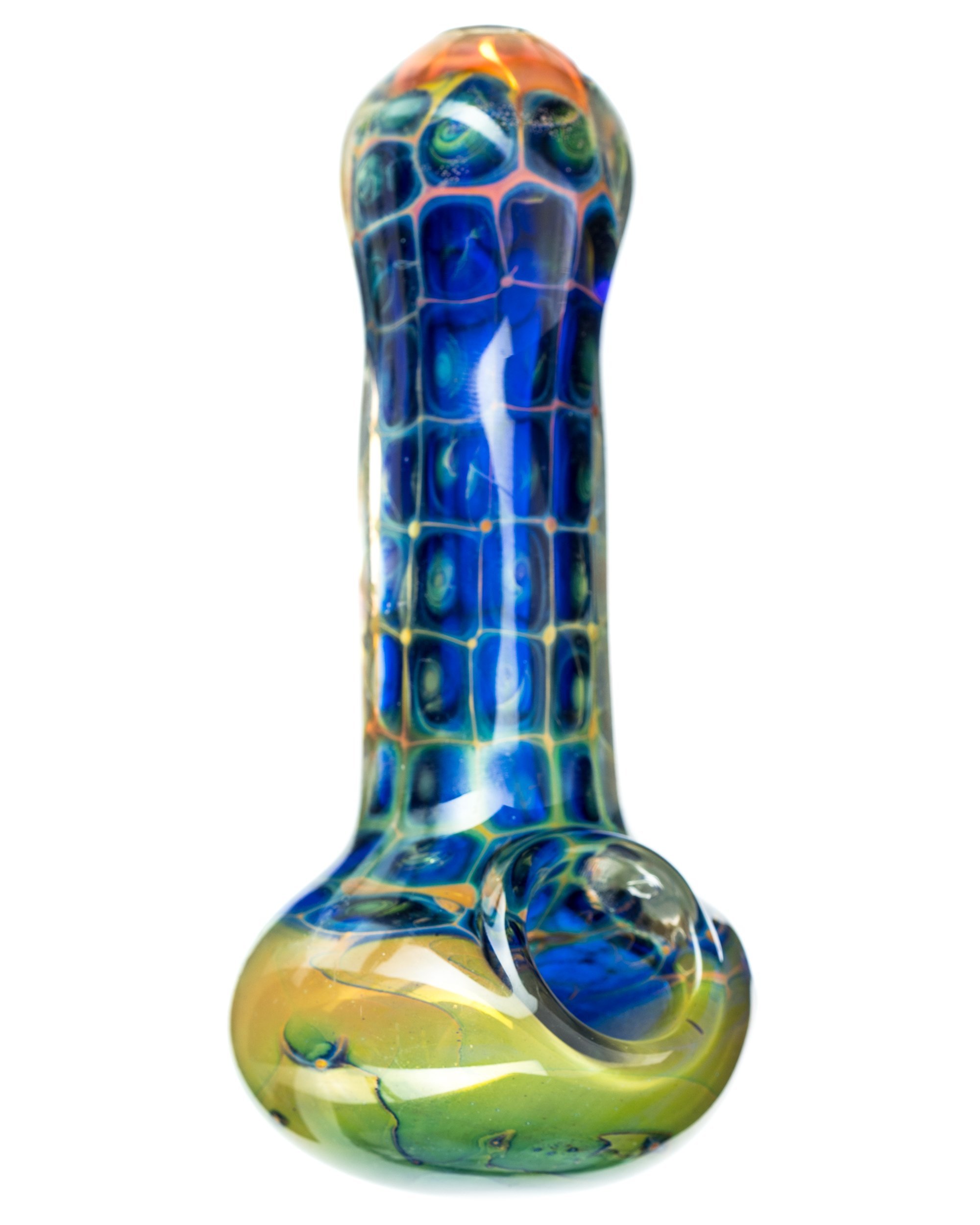 This thick glass hand pipe is perfect for a daily driver. The pipe has multiple layers of glass to create the droplet effect. Around the droplets, there are blue and aqua-like colors to give definition to the droplets. The spoon has a deep bowl to pack a huge amount of tobacco or dry herbs in. Color varies.