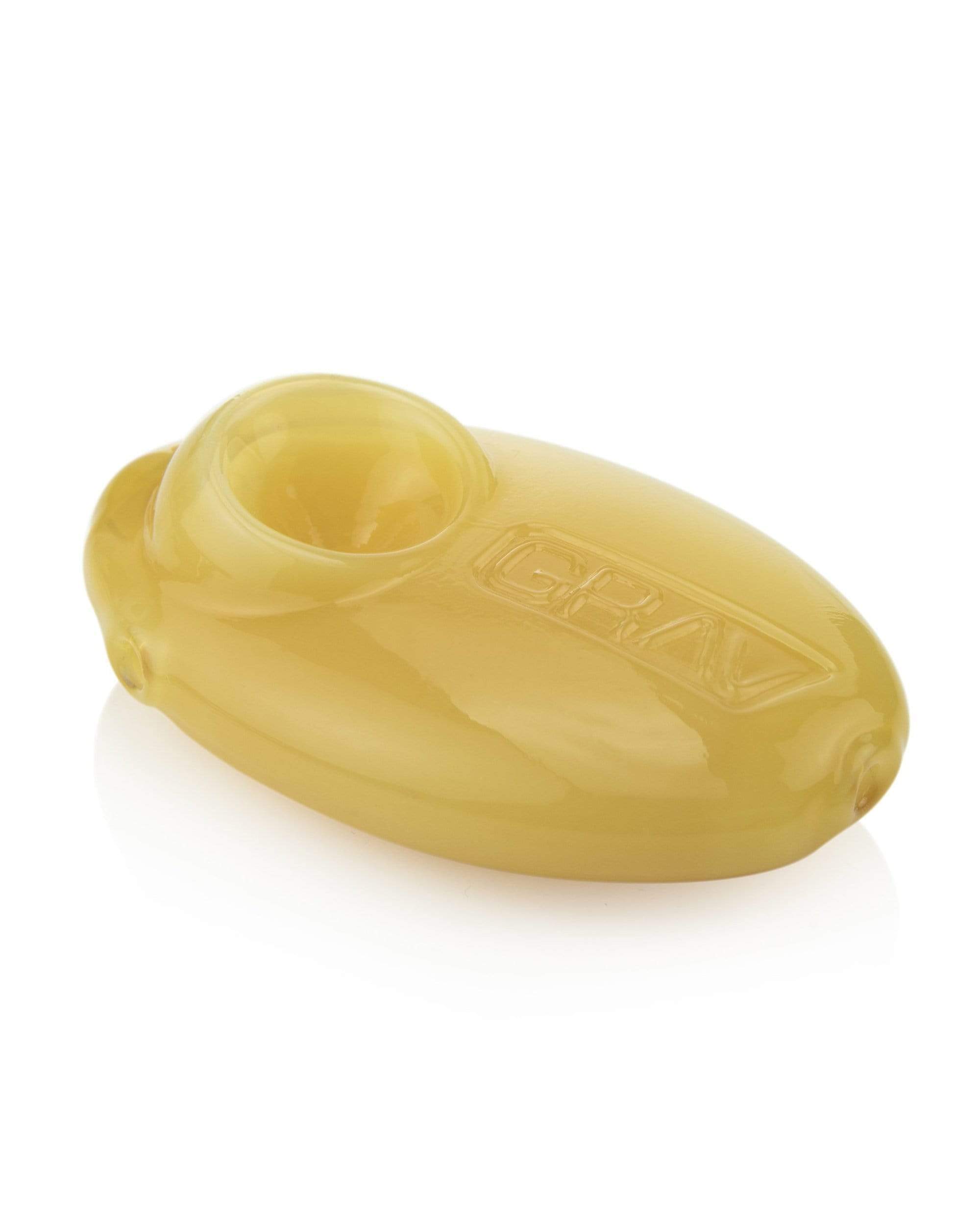Pebble Spoon Pipe, The Pebble Spoon Pipe is designed to fit comfortably in the user’s hand, with its round shape and small size. This pipe also features a side carb, deep flush bowl, and The GRAV logo molded into the top side. It measures 3” inches long and features a raised bowl and ergonomic chamber that fits comfortably in your hand. Compact and discreet, this hand pipe is ready to go on an adventure with you! It’s also durable, made on thick 44mm tubing.