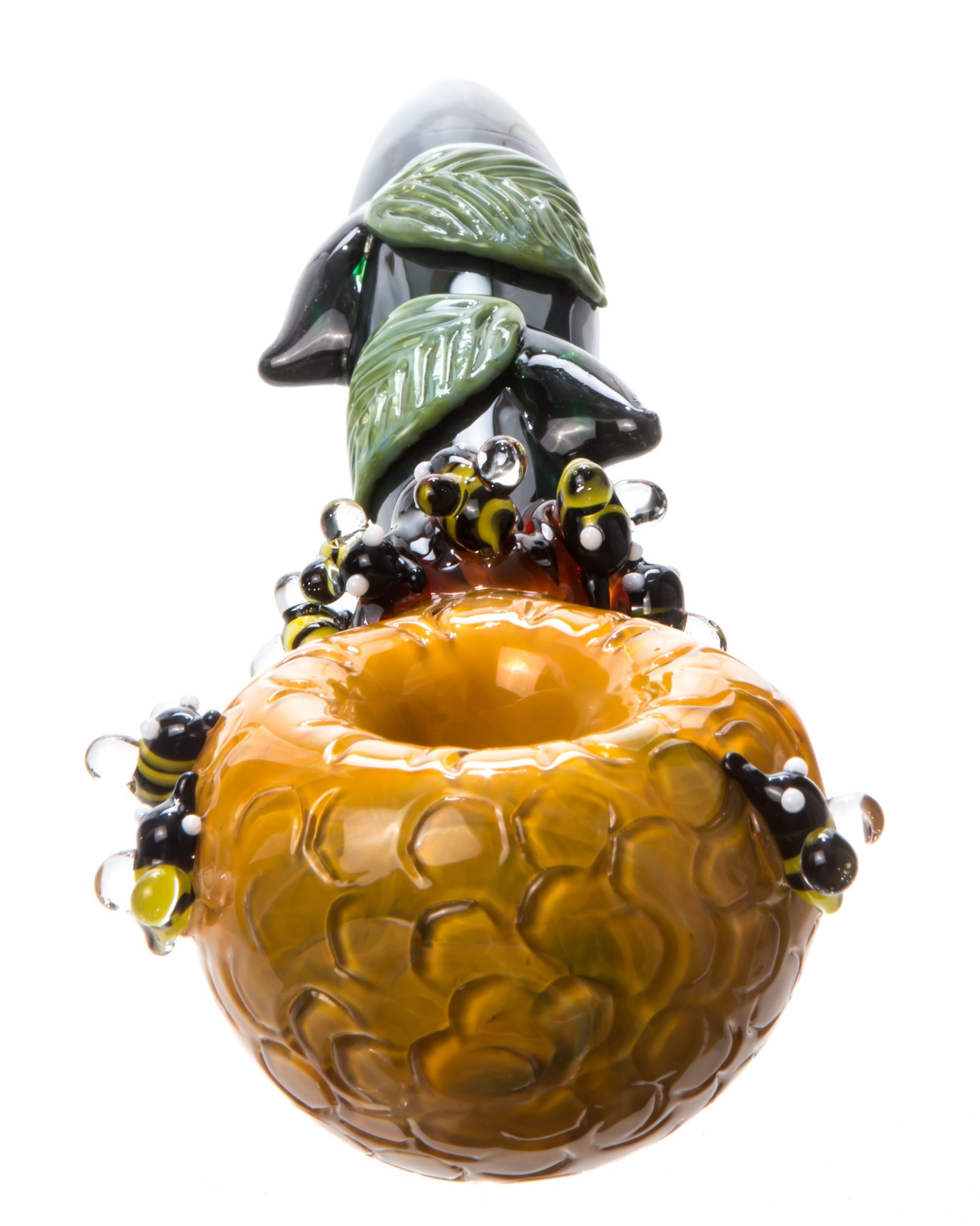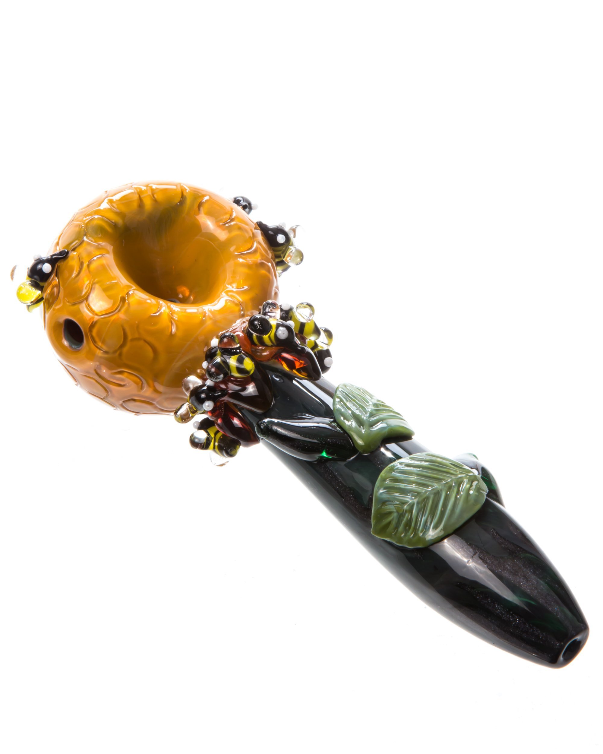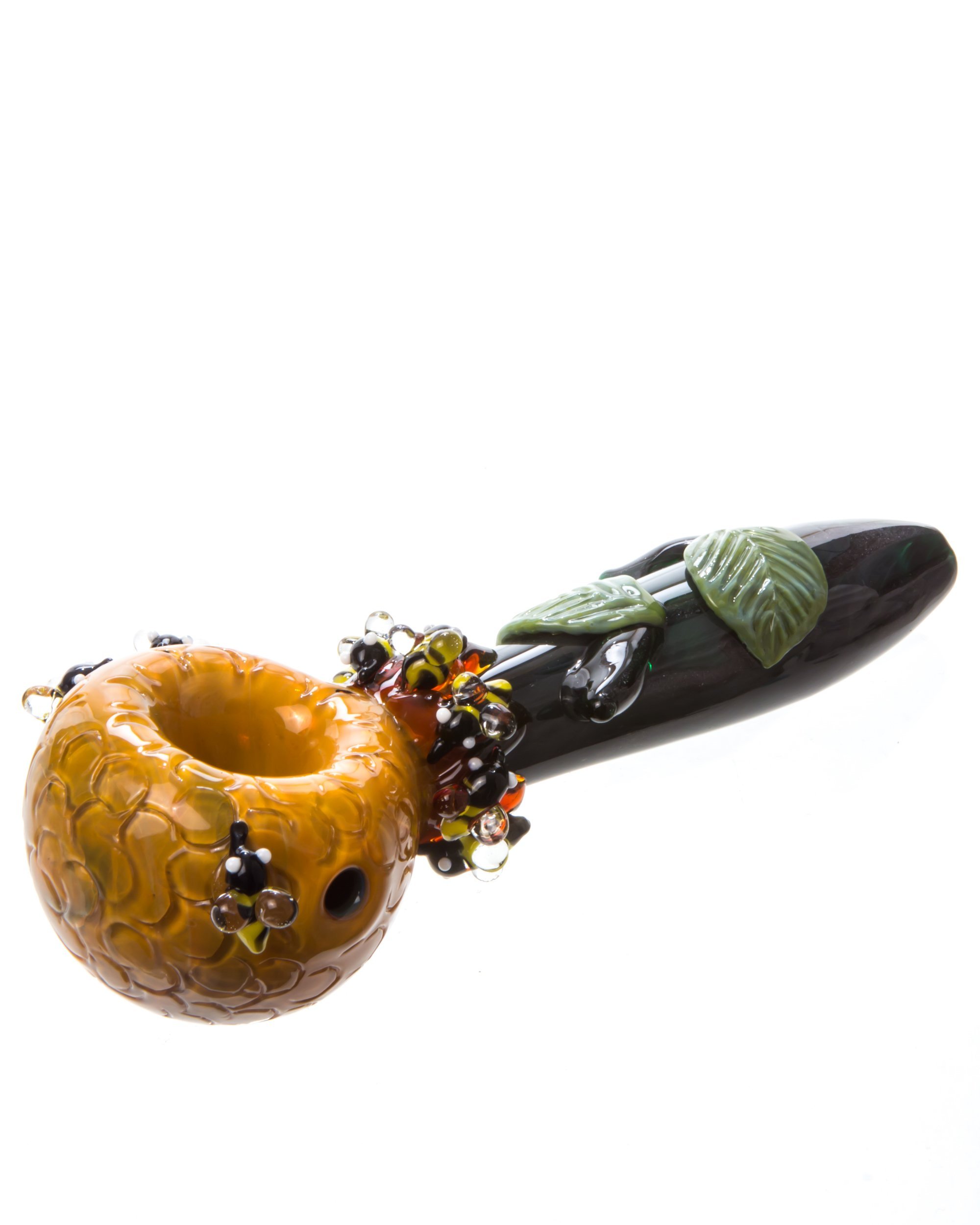 This HoneyPot themed hand pipe from Empire Glassworks features an assortment of vibrant colors that really make this hand pipe a thing of beauty. The incredible green tubing features raised leaves, while the neck and the bowl feature detailed glass honeybees. The deep bowl has a honeypot design made from orange glass that showcases a honeycomb pattern. This themed glass hand pipe is made from thick borosilicate glass in Placentia, California.